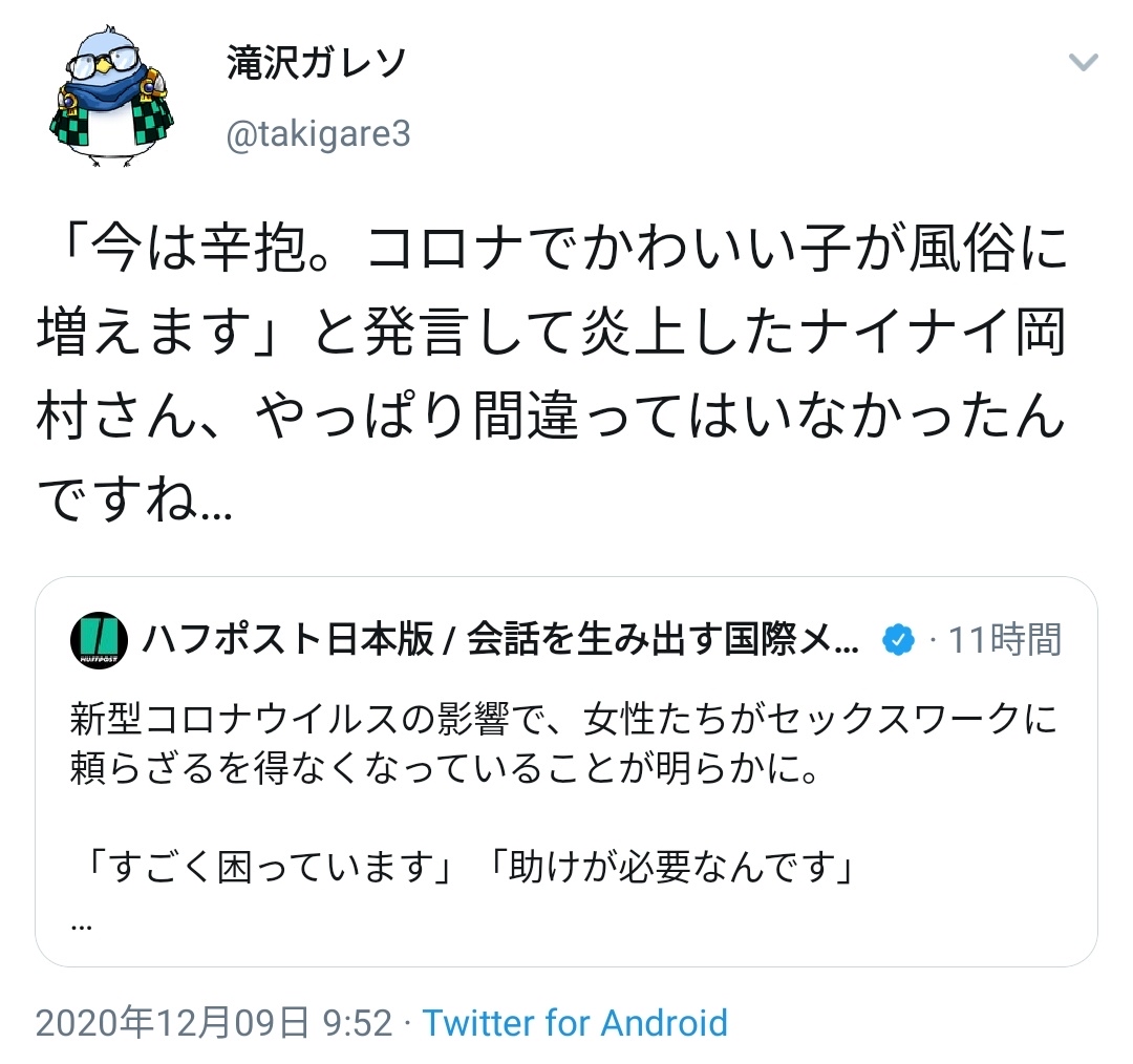 ツイ民「岡村の風俗落ちが増えるって発言正しかったんだな」→フェミ「それどういう意味?(威圧」