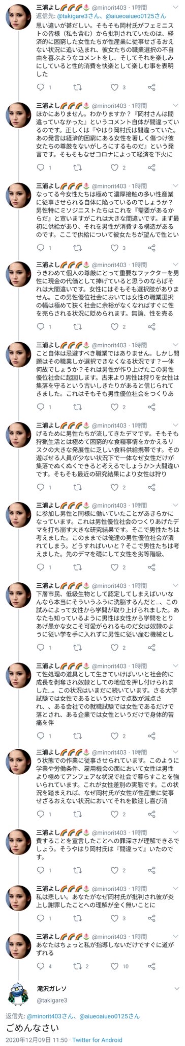 3枚目のリプで上手く返されてフェミさんが文脈からズレて自分語り長文お気持ちツイートしてんの草